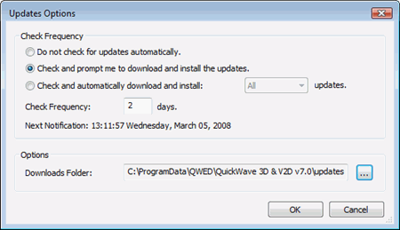 The software can check for updates automatically from QW-Editor and QW-Simulator. To configure automatic updates, press Configure QuickWave Updates in the Help menu of QW-Editor or QW-Simulator. The following dialogue will appear: