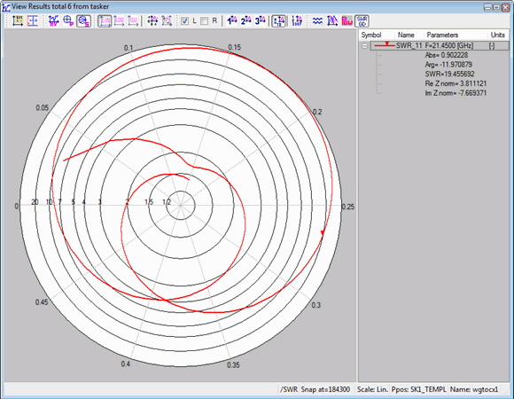 Starting with version 7.5, Setup-Coordinates-Smith option of the View-Results window produces two different charts, depending on the Setup-Switch-SWR&GD switch. When the latter switch is off, a standard Smith chart is displayed, as in previous software versions. When the latter switch is on, a Rieke form of the Smith chart is displayed. In the Rieke chart, the quantity plotted is equal to SWR in magnitude but with the phase of S11. In the radial direction, the Rieke chart spans the whole range of reflection values, from |S11|=0 (SWR=1) at the chart centre to |S11|=1 (SWR-->inf) at the chart outermost circumference. Scaling in the radial direction is linear in terms of |S11|, gridding is shown in terms of the SWR values. Hence the value in the chart centre is 1 and consecutive rings are placed by default at 1.2 1.5 2.0 3.0 4.0 5.0 7.0 10 20. Different rings, at arbitrary positions, can be enforced by the user through a gridlines.gr3 file in the project directory. Radial phase lines in the Rieke chart are placed by default at every 0.05 wavelength. Different angular spacing can also be obtained through a gridlines.gr3 file in the project directory.